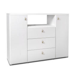 Mueble multifunción con 3 cajones con correderas metálicas, 2 puertas y 4 estantes internos.