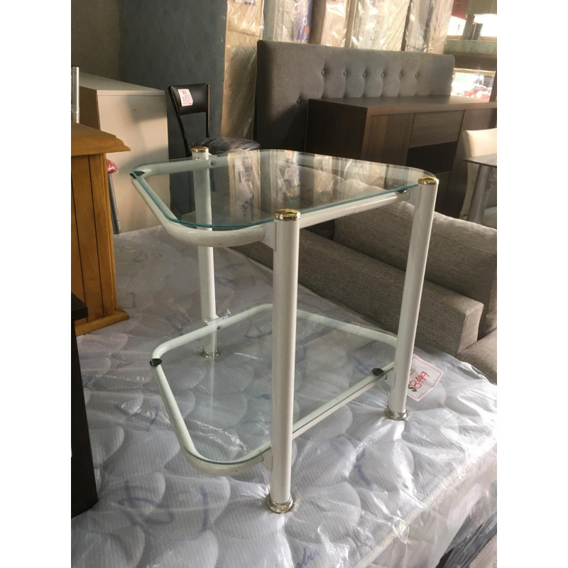 Mesa de Luz o de Arrime de caño blanco con estantes de vidrio.
