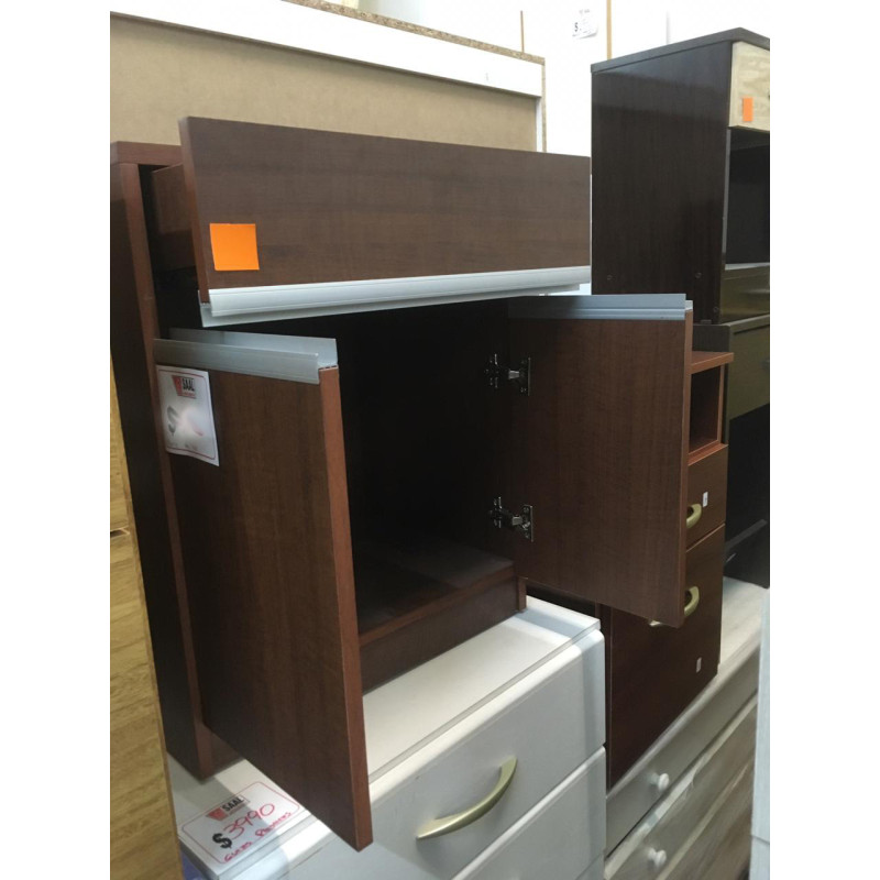 Mesa de luz con dos puertas y cajón con corredera metálica y perfiles de aluminio. Estructura fabricada en melamina de 18mm. Modelo: 6028. Medidas: 0.52x0.60x0.38m. Fabricante: Table's