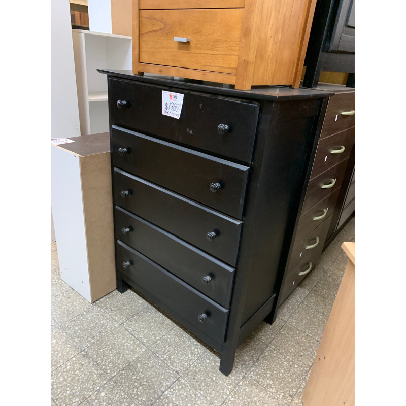 Chifonier con 5 cajones con correderas metálicas, de madera lustrada. Lustre color Tabaco (negro). Línea Quality. Fabricante: Cravero. (Producto en liquidación con detalles como se exhibe).