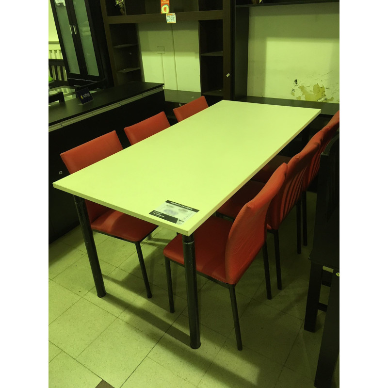 Mesa de tapa de melamina blanca con cantos ABS 2mm de 1.70x0.85m. con base de caño con patas 2" diámetro color negro. Fabricante: Dielfe. (Producto discontinuado, en liquidación con detalles.)